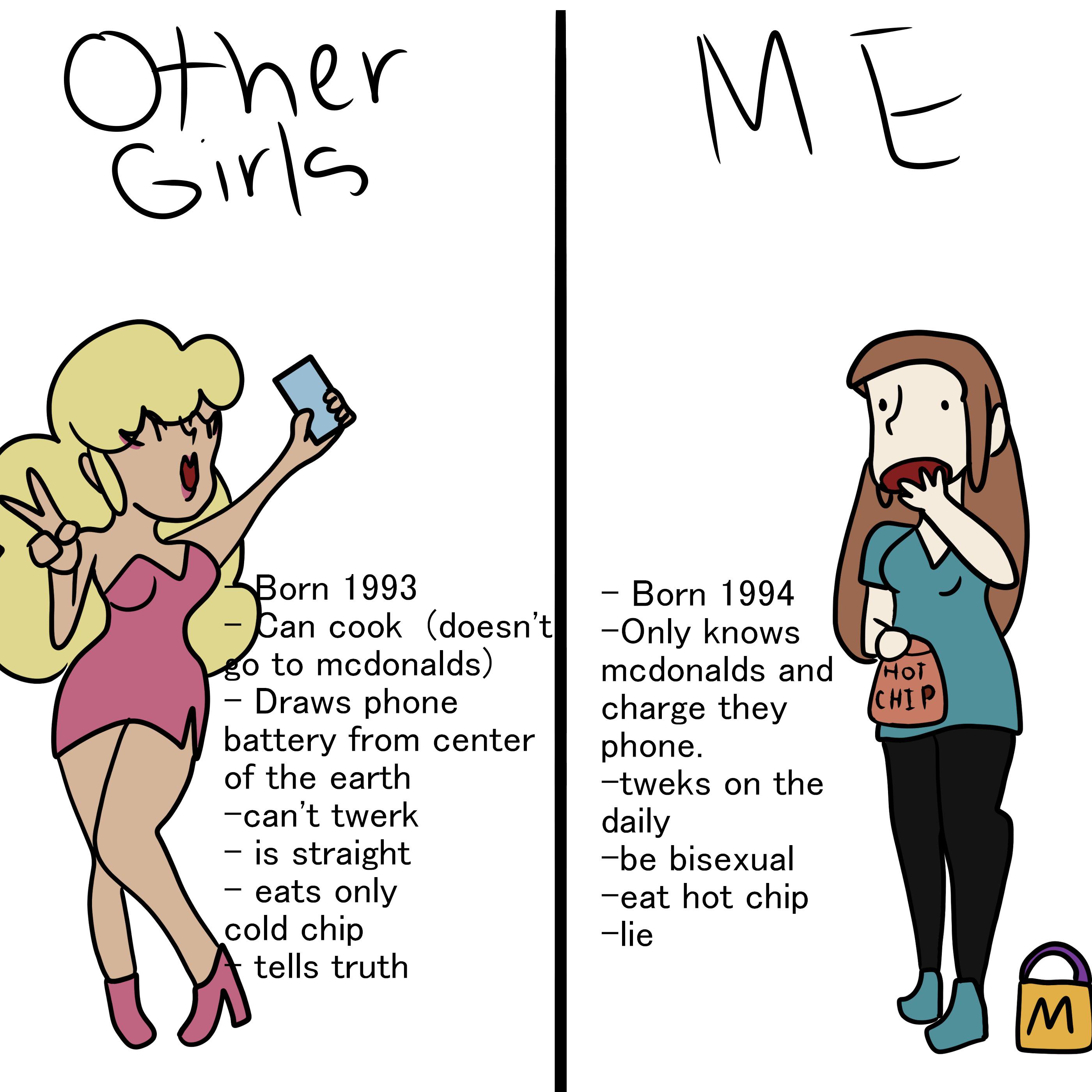 Any female born after 1993 can't cook, all they know is mcdonalds, charge their phone, twerk, be bisexual, eat hot chip and lie, read the .
