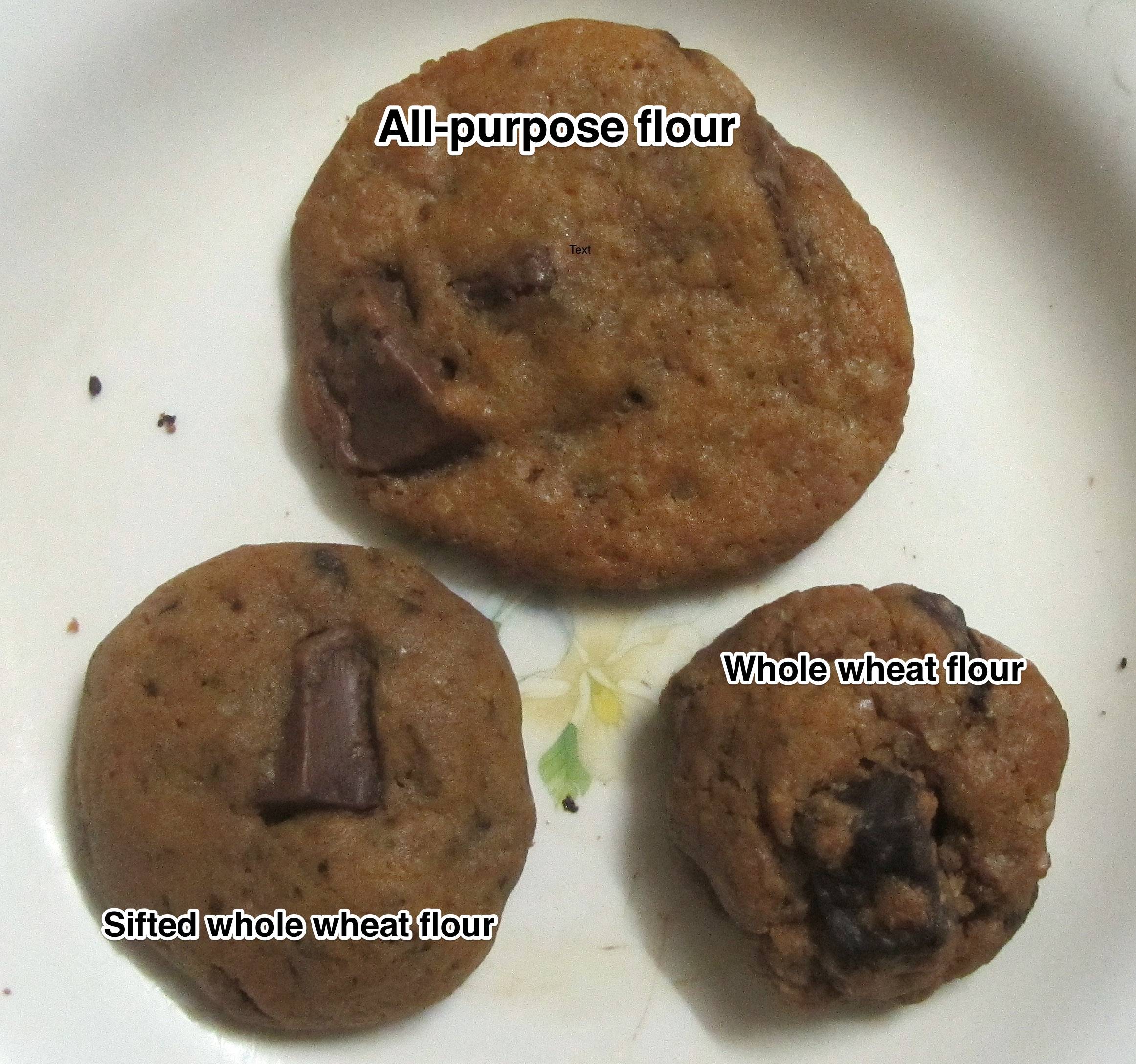 Stir the flour into the cookie dough, then the chocolate chips, mixing just until combined. Mix sugars, butter, vanilla and egg in large bowl. Stir in flour, baking soda and salt (dough will be stiff). Ingredients · 1 cup butter, softened · ¾ cup white sugar · ¾ cup brown sugar · 2 large eggs · 1 teaspoon vanilla extract · 3 cups whole wheat flour · 1 teaspoon baking . 3 cups (339 g) whole wheat flour · 1 tsp baking soda · 1½ tsp baking powder · 1½ tsp kosher salt · 1 cup (2 sticks, 226 g) unsalted butter softened