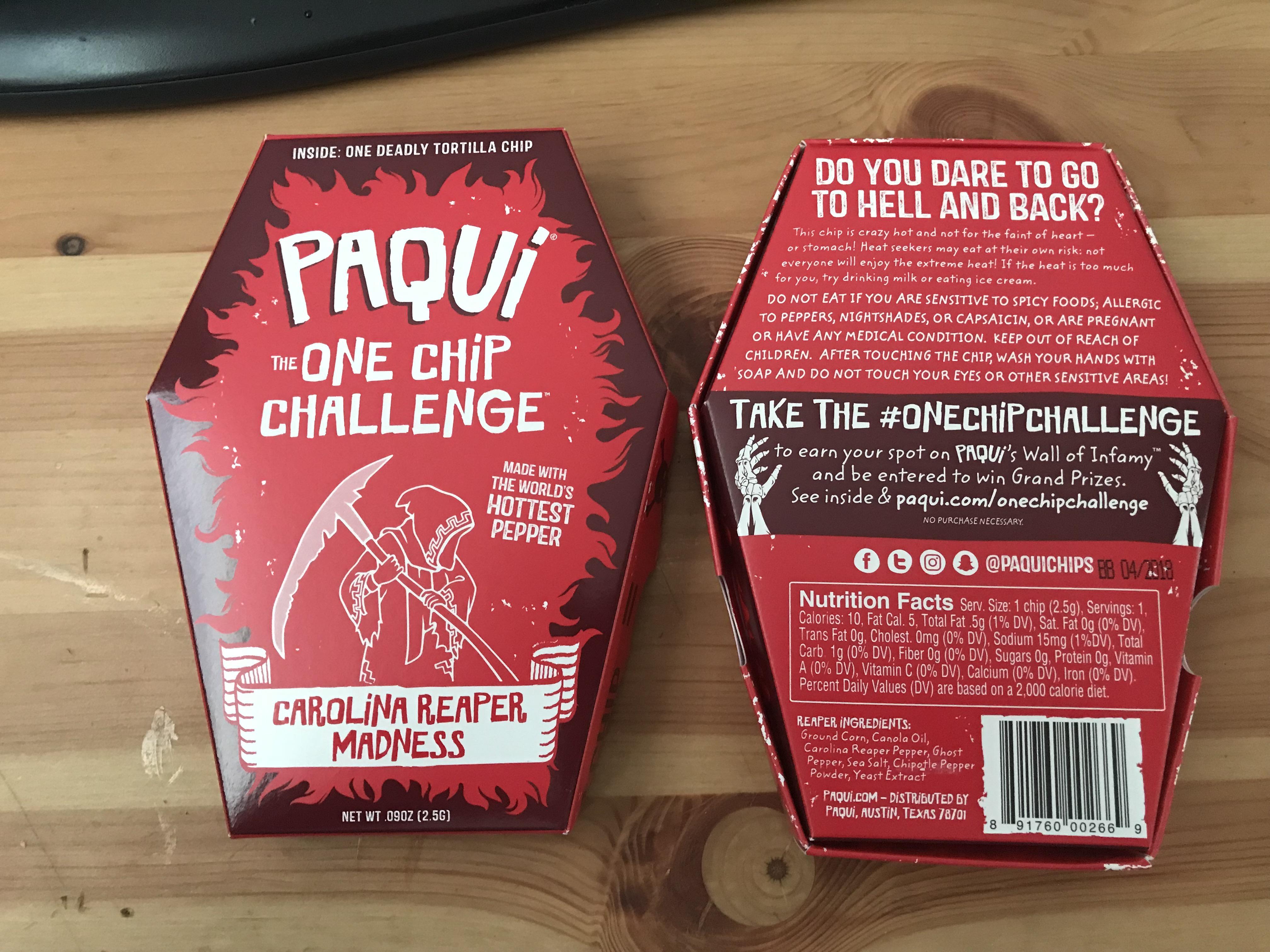Buy paqui one chip challenge / carolina reaper madness chip in singapore,singapore. 0.16 ounce (pack of 1). Sold out on amazon but you might be able to find . Check out our carolina reaper chip selection for the very best in unique or custom, handmade pieces from our shops. Try the world's hottest chip made with the hottest chile pepper on the planet, the carolina reaper. This year's chip is all thriller, no filler with two totally terrifying peppers: Try the world's hottest chip made with the hottest chile pepper on the planet, the carolina reaper. Paqui carolina reaper madness one chip challenge tortilla chip. · do you dare take the #onechipchallenge to earn your place . Try the world's hottest chip made with the hottest chile pepper on the . Straight from south carolina's soil, we bring you the world's hottest chili pepper on a chip available in 12 count and 24 count cases of 2 oz bags. Asmr paqui one chip challenge world's hottest carolina reaper pepper eating sounds mukbang. The infamous carolina reaper and the stinging scorpion pepper.