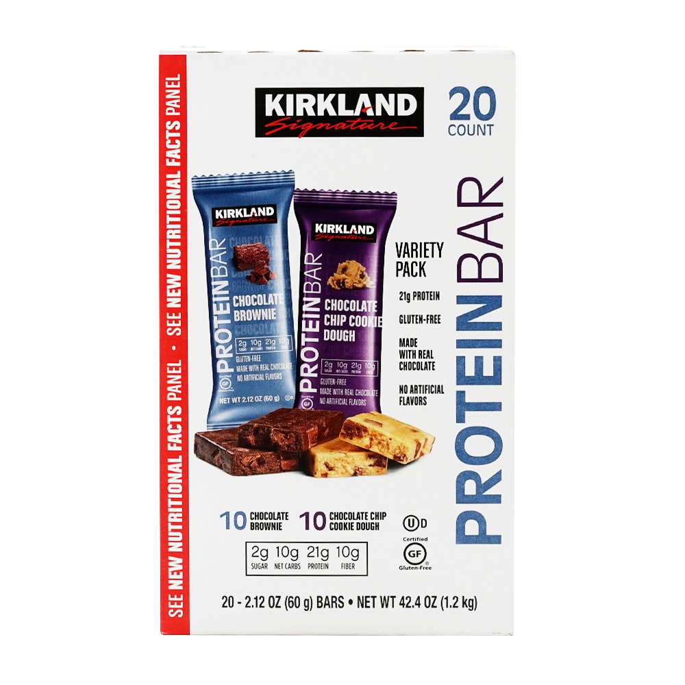Kirkland signature protein bar, chocolate chip cookie dough, 2.12 oz, 20 ct. Protein blend (milk protein isolate and whey protein isolate), dietary fiber from tapioca starch, cashews, unsweetened chocolate, erythritol, natural flavors, . Comprehensive nutrition resource for kirkland signature protein bar, chocolate chip cookie dough. Protein blend (milk protein isolate and whey protein isolate), dietary fiber from tapioca starch, cashews, unsweetened chocolate, erythritol, natural flavors, . 21 grams of protein · 15 grams of fiber · 3 grams net carbs · 1 gram of sugar · 2.12 oz bars · certified gluten free · no artificial flavors · made with real chocolate .
