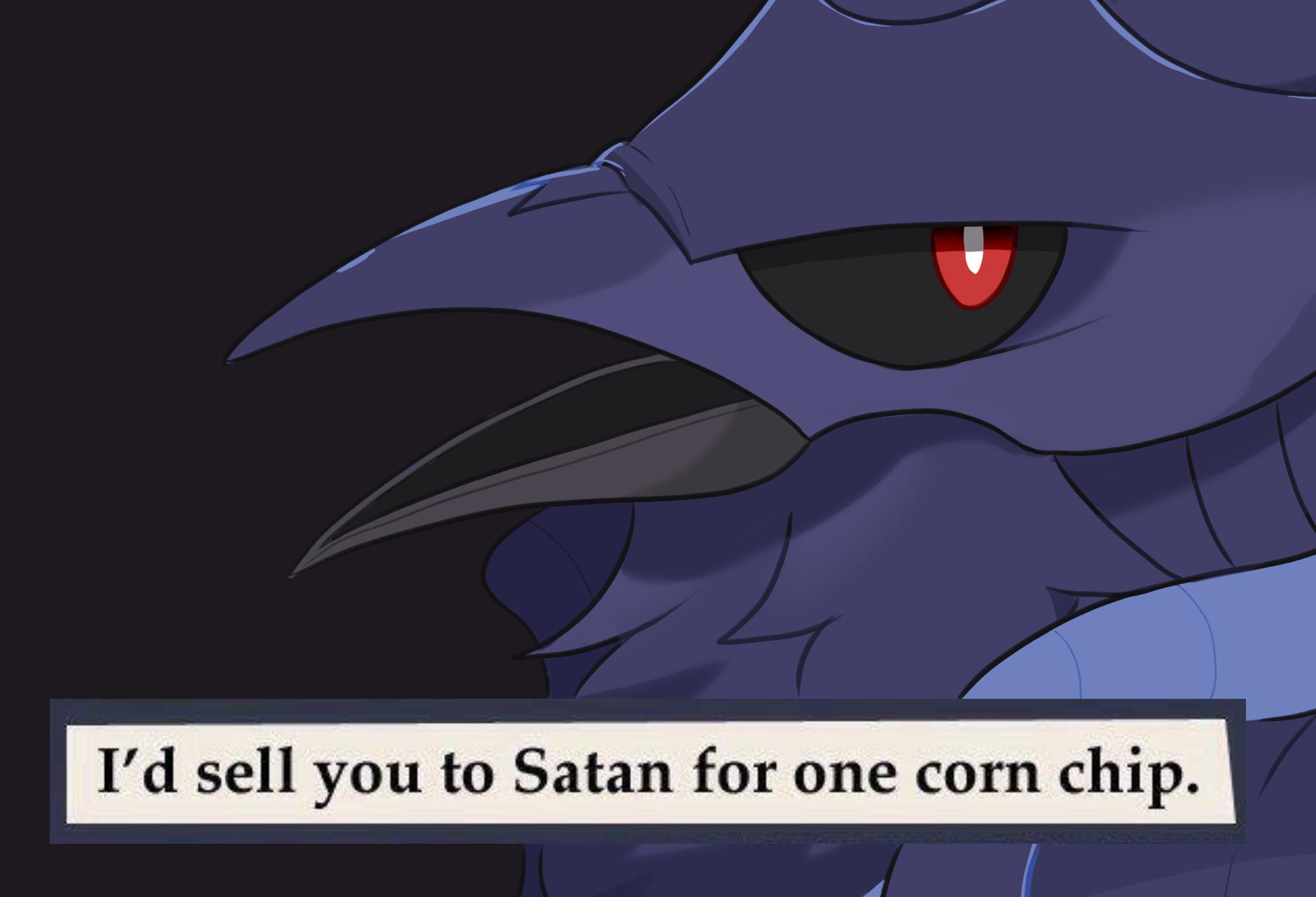 See more 'i'd sell you to satan for one corn chip' images on know your meme! I'd sell you to satan for one corn chip. I would sell you to satan for one corn chip. I'd sell you to satan for one corn chip. One of these images shows a bird with the caption i'd sell you to satan for one corn chip (shown below).