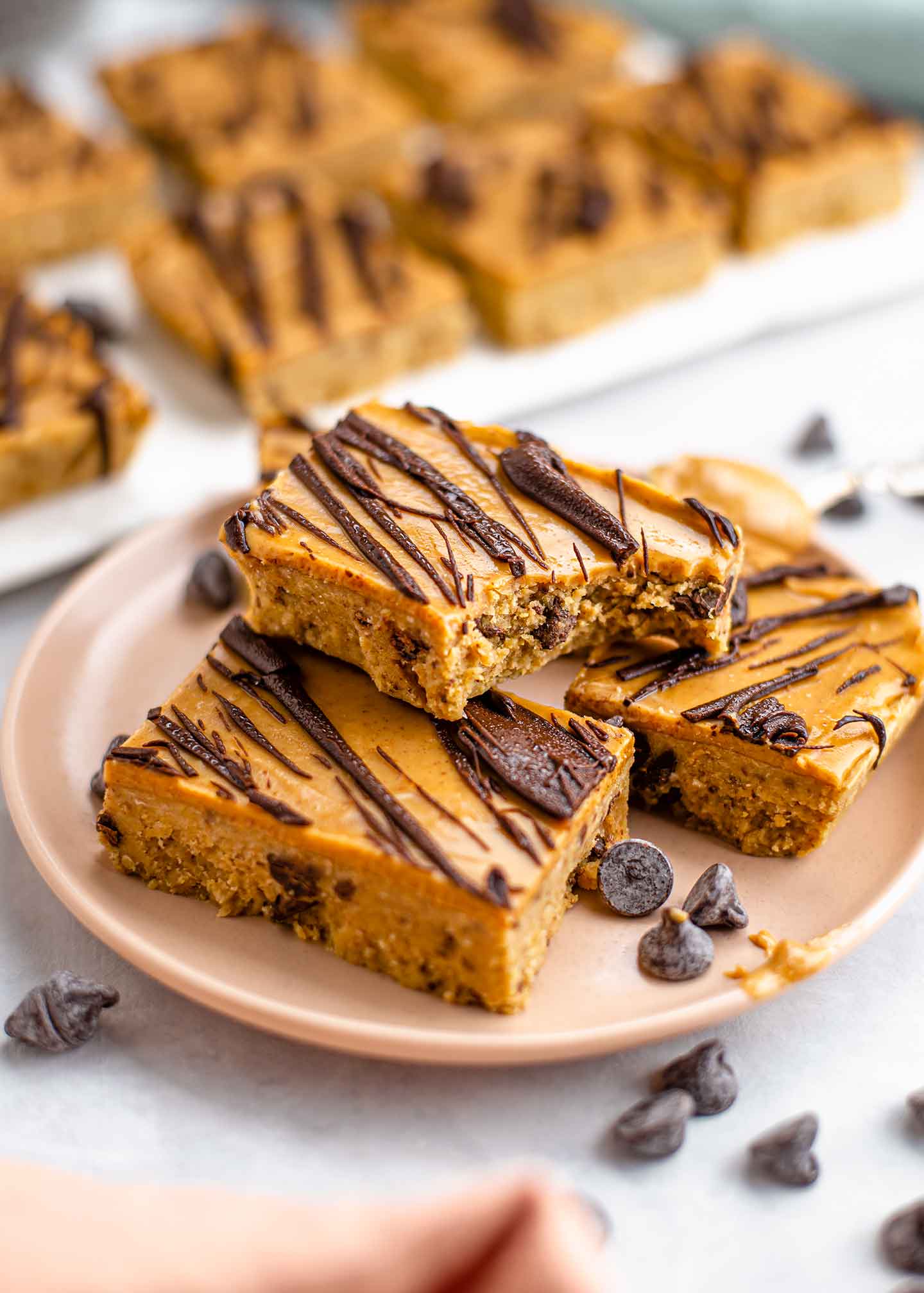 · fold in mini chocolate chips. Cut cookie dough in half. Peanut butter chocolate chip cookie bars · ½ cup plus 2 tablespoons creamy peanut butter* · ¼ cup plus 1 tablespoon melted coconut oil · ¼ cup plus 1 tablespoon . · stir sweetened condensed milk . Mix in salt and vanilla.